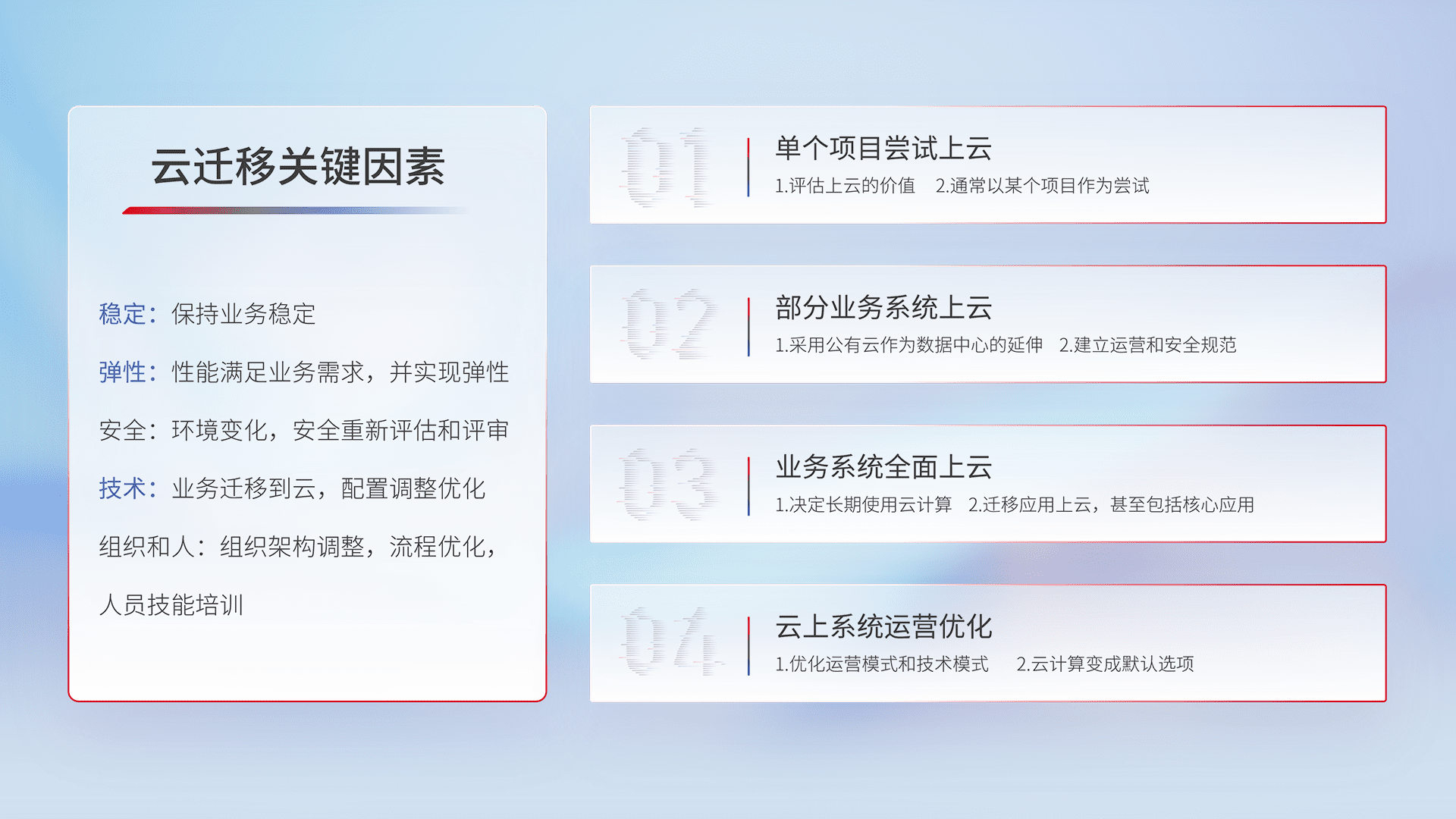 结合实际业务,,从规划设计、、、、云平台选型、、云原生改造、、、、数据迁移、、、、集成交付,,,迁移全过程为客户识别最佳上云路径,,,做好风险识别管理,,,,设计网络架构、、身份权限、、、安全审计合规、、、、操作审计、、日志审计、、、、监控告警策略、、多站点容灾设计等,,,对云上基础设施进行整体规划,,,,提升IT治理水平,,以满足弹性、、高可用、、高性能的需求。。。