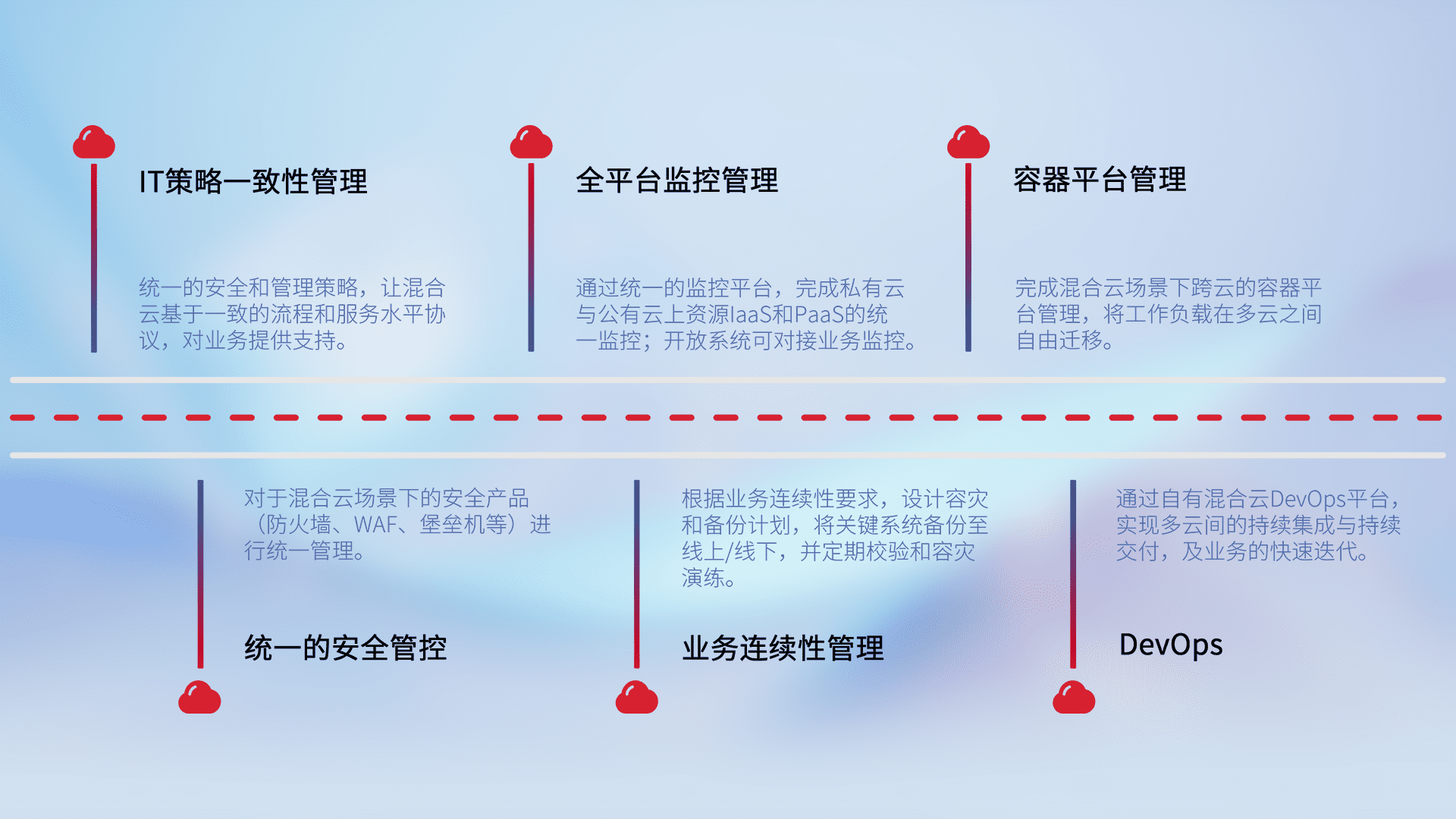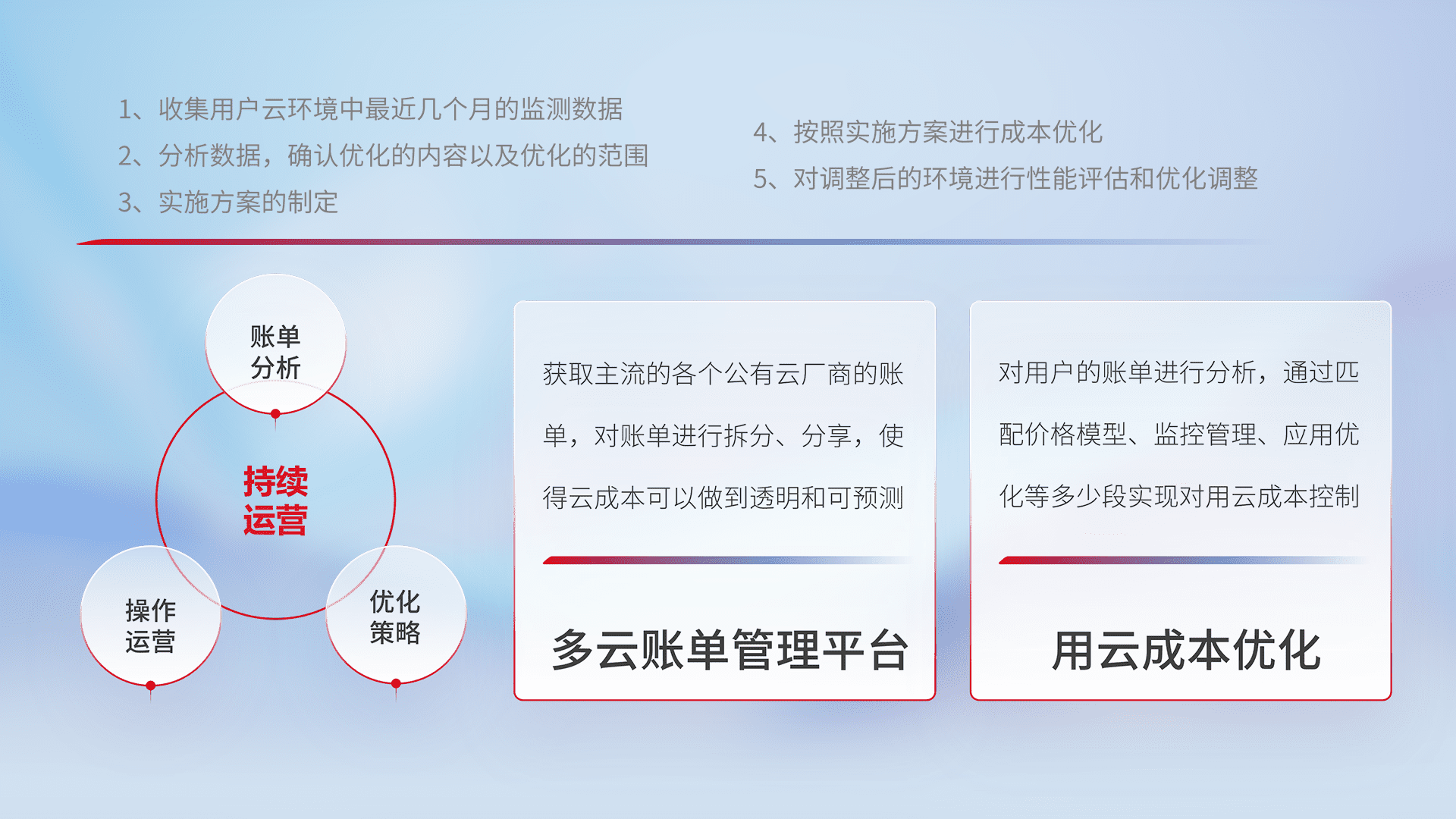通过多云纳管,,,以统一的资源数据模型把客户的云资源进行抽象和封装,,进而实现对多云资源的统一操作,,,,保障云资源管理的可靠性、、、稳定性与可用性。。量身定制化运维内容,,,配置、、、、开发运维、、、补丁管理、、、、备份、、监控、、、、认证和访问管理、、审计和日常巡检等,,保障在用云过程中的可靠度,,,稳定度以及高可用率。。。