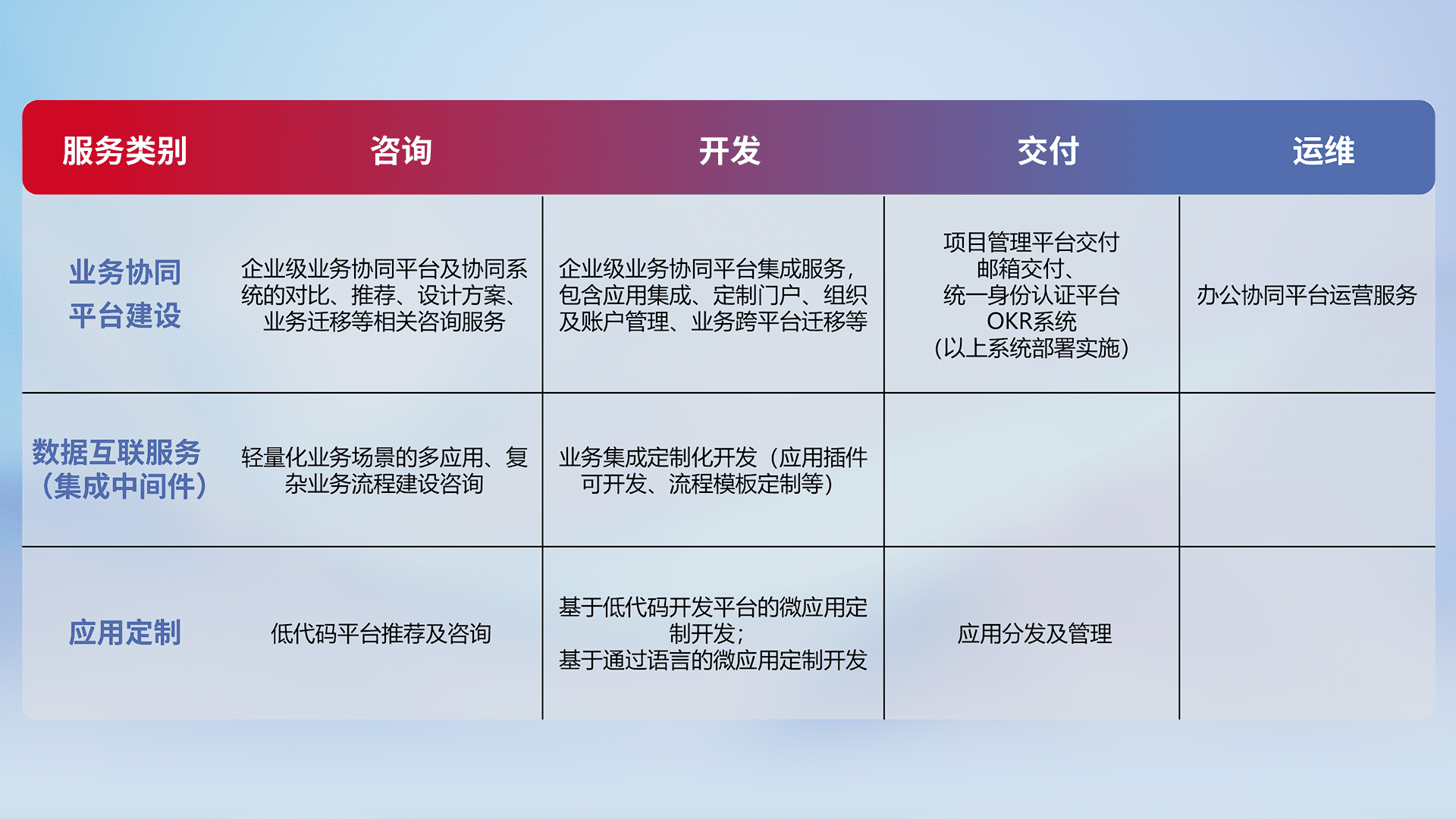 针对钉钉、、企微、、IDaas等平台级产品提供产品的规划、、、、方案、、交付、、定制化开发等服务,,,,实现如统一协同办公、、、、智能客户服务、、、、混合会议管理、、、、智能数据查询、、等业务场景,,实现数字化转型。。。。